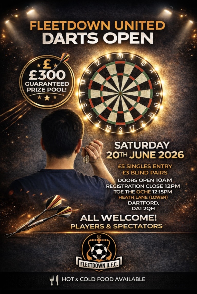 Events Coming Up at Fleetdown Football Club Live Music - Saturday 18th April 2026 Fleetdown United Football Club presents their next instalment of Live Music. We would like to present “Noelasis”.Tickets are just £10.Please contact marketingofficer@fleetdownunitedfc.org.uk for tickets or see Amanda at the Bar. Fleetdown United FC Darts Open - Saturday 20th June 2026 The Fleetdown United FC Darts Open returns to the club on Saturday 20th June 2026.£5 Singles Entry£3 Blind PairsDoors Open at 10amEveryone is welcome