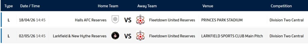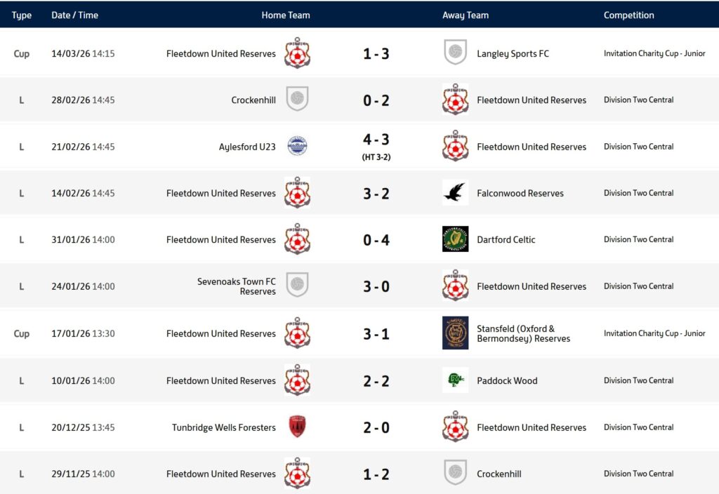 Reserves Fleetdown United FC’s Reserves currently play in Division 2 Central of the Kent County League.Manager: Paul LakinPhone Number 07779 993310E Mail: squiddylakin@yahoo.co.uk Fixtures Results League Table