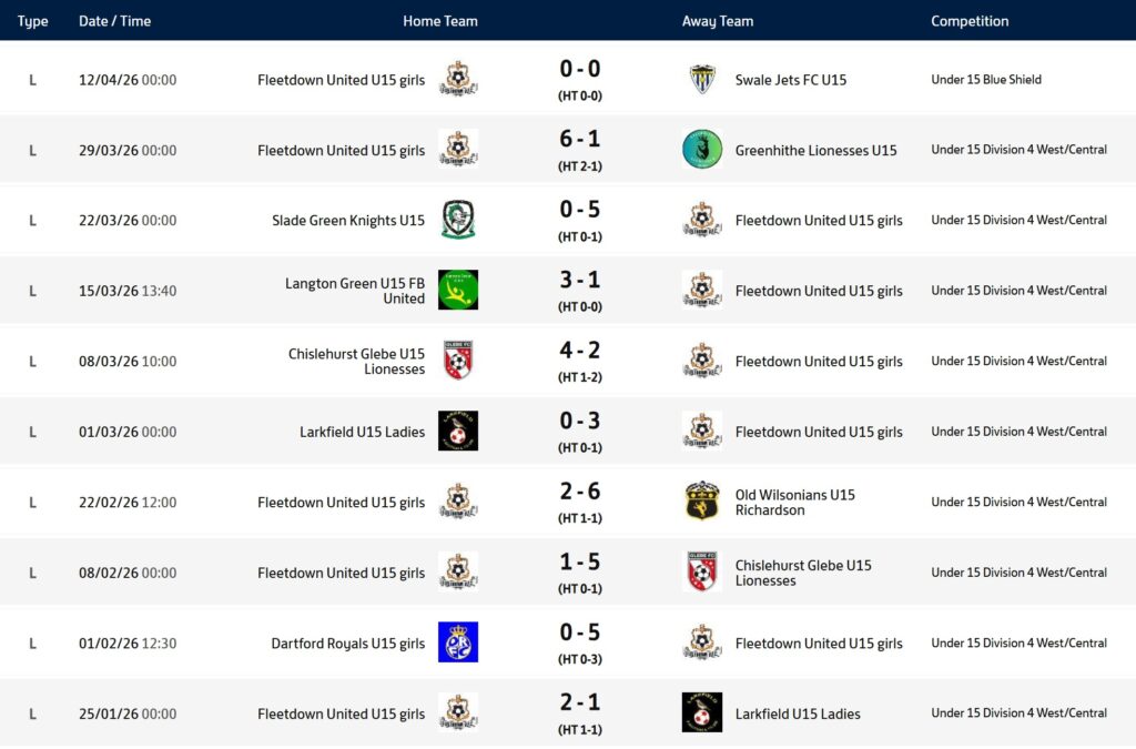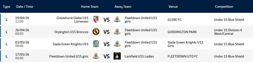 FLEETDOWN GIRLS U15's Sponsored By Manager: Hayley StonePhone Number 07368 276317E Mail hayleystone2022@hotmail.comAssistant Manager: Graham StonePhone Number: 07800 899381E Mail: graham.stone@sky.com Fixtures Results League Table Shield Table